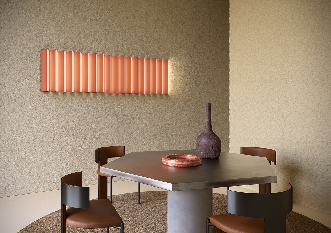 A minimal, triangle-shaped lamp with a form that symbolizes ancient cultures – a graphic that represents the four elements. This is a special edition …