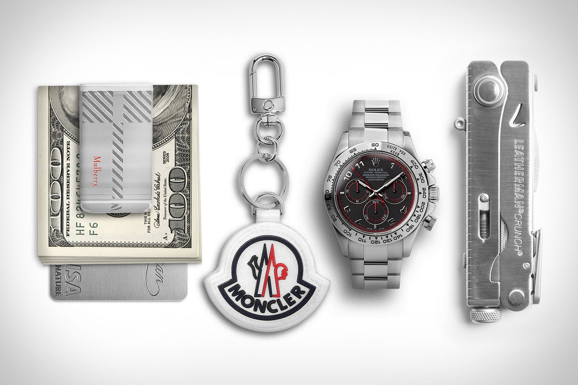 Mulberry Silver Money Clip / $130. Moncler Logo Keyring / $330. 2005 Rolex 18K WG Daytona 116509 Watch / $38,850. Leatherman Crunch Multi-Tool / $110.
