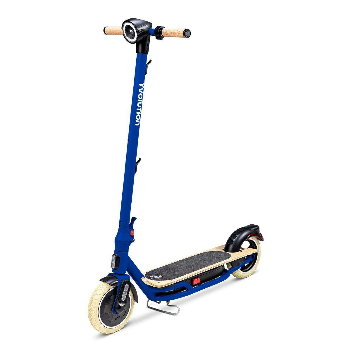 At first glance, the Yvolution Yes electric scooter looks different. The puncture-proof tires are white. The soft, anti-vibration rubbery handlebars look like faux wood. The deck seems to have come right off the side of an old Woody station wagon. The headlight is huge. A bell on the right handlebar …