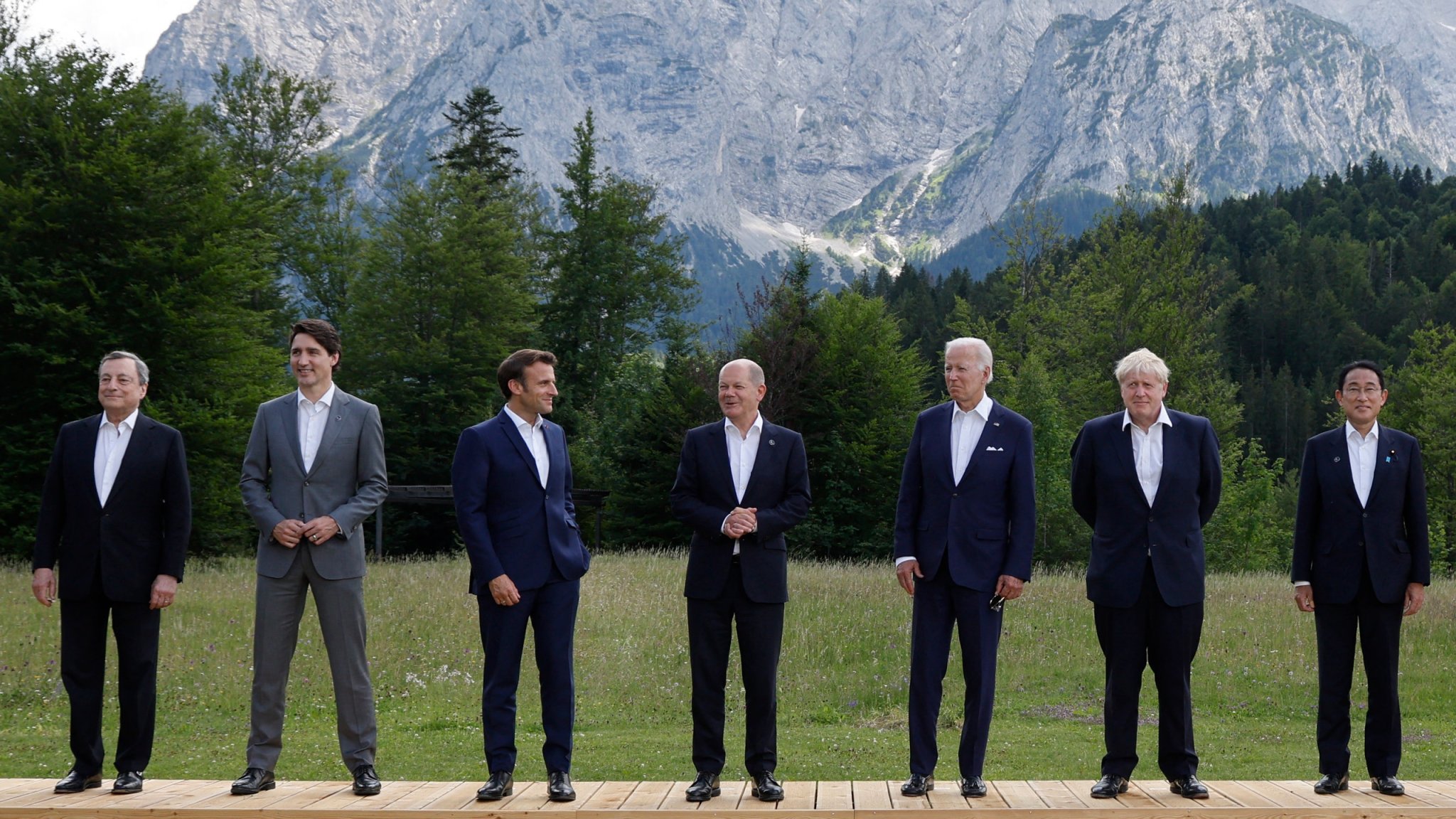Italy's Prime Minister Mario Draghi, Canada's Prime Minister Justin Trudeau, France's President Emmanuel Macron, Germany's Chancellor Olaf Scholz, US President Joe Biden, Britain's Prime Minister Boris Johnson and Japan's Prime Minister Fumio Kishida pose during the G7 Summit on June 26.JONATHAN …