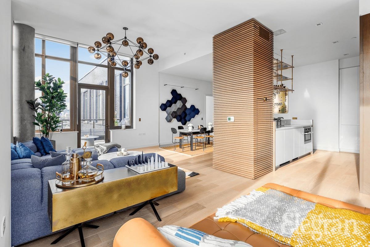 This stylish urban penthouse has everything one needs for living large in Manhattan. Refined finishes and fixtures, bold contemporary design and clean lines give the dwelling an open, airy vibe well beyond its nearly 1,600 square feet of living space. Enhancing that feeling are 12-foot tall exposed …