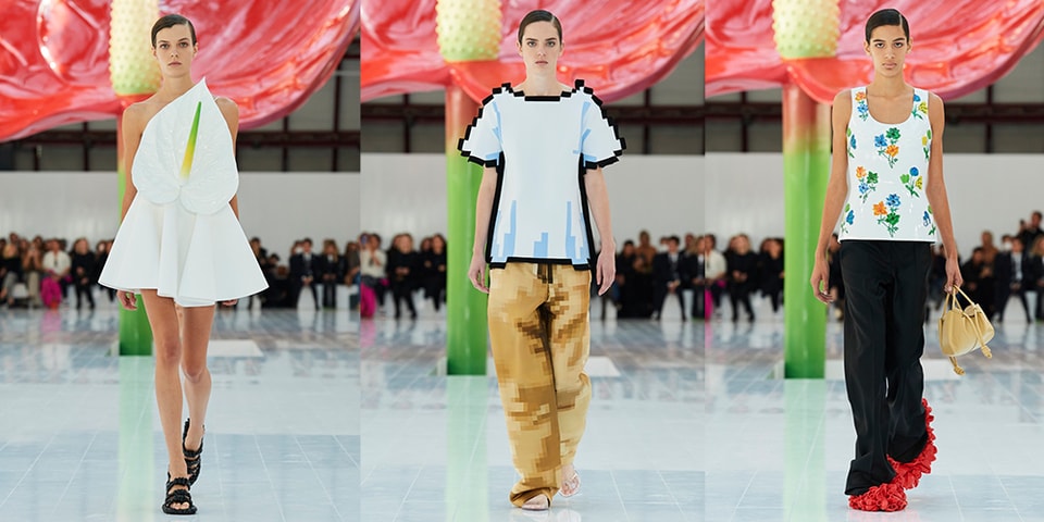 ピクセル化されたTシャツ、アンスリウムをモチーフとしたアイテム、ツイストニットワンピース、レザージャケット、花柄のエナメルメタルトップスをはじめ、スパイクヒール、空気を抜いた風船で作られたパンプス、シルバーの編み込みブレスレット、人気のPuffer Goya …