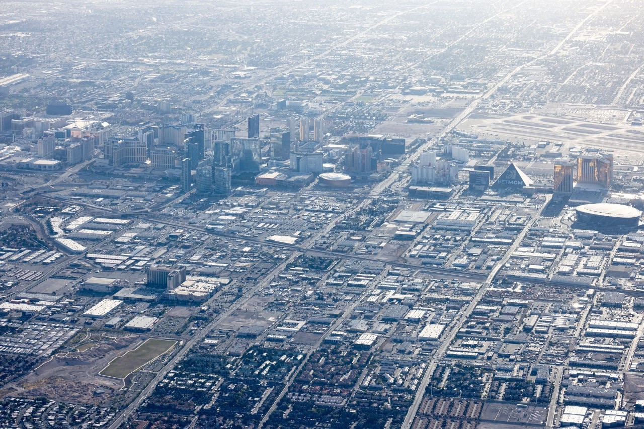 Vista dall’alto, l’area a sud di Las Vegas è una piatta distesa di basse e anonime costruzioni industriali e residenziali in mezzo al deserto …
