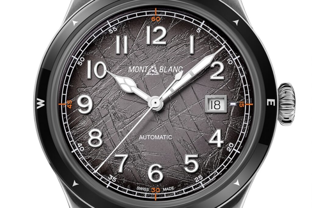 This second model in the collection is inspired by Montblanc’s Mark Maker Reinhold Messer, the mountaineer who climbed all 14 of the world’s highest peaks. It is a titanium watch with a 42 mm diameter case with a bidirectional ceramic bezel above it that displays the cardinal points.