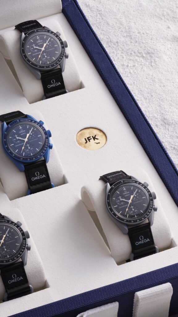 The suitcases, containing a gold monocle with the OMEGA x Swatch logo and a unique coin engraved with the 3-letter aviation code of the city shown, are equally special. Each suitcase is associated with a specific city, with the code engraved on the side of all the watches inside. The auction will take place at Sotheby’s and will be accessible online worldwide at Sothebys.com, where bids can be placed from February 12th until February 24th, coinciding with the next full moon.